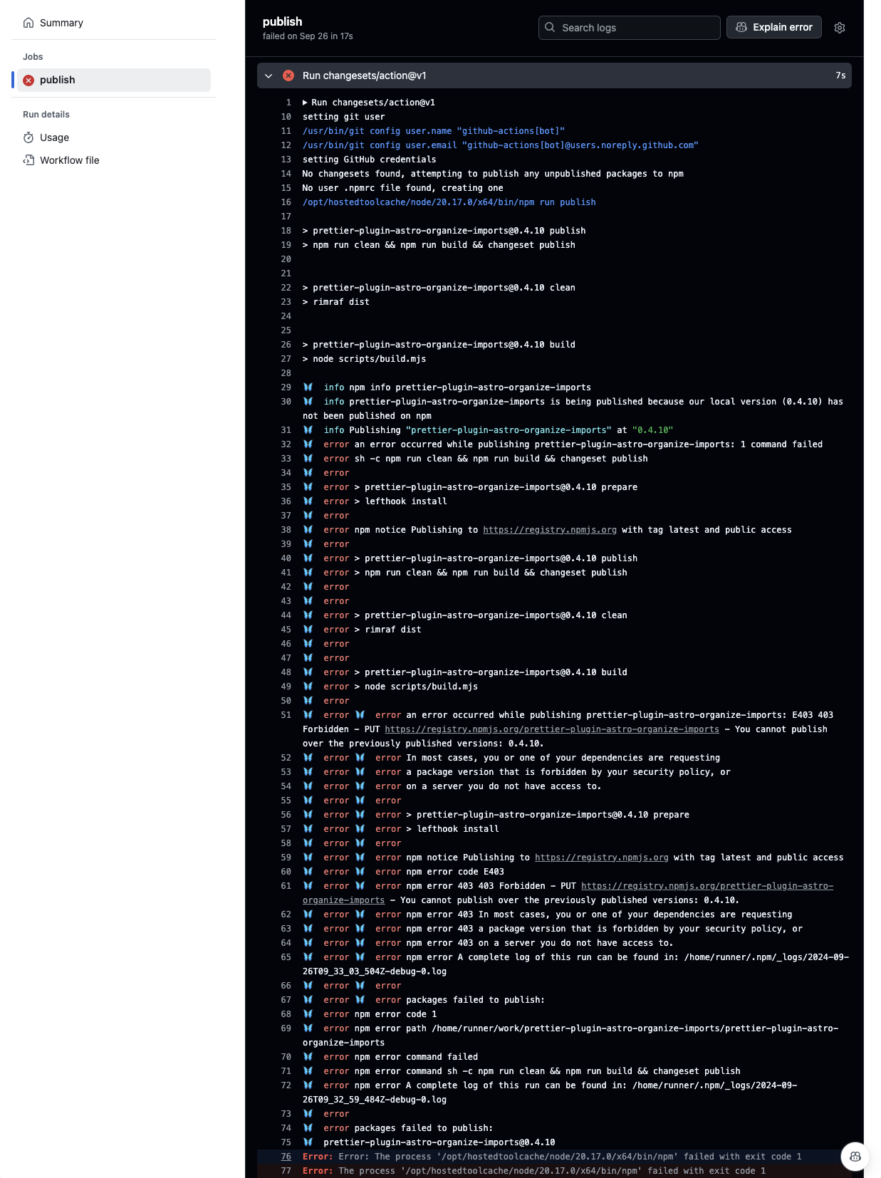 こちら (opens in a new tab)の自作パッケージのバージョニングのためにChangesets (opens in a new tab)を使っているのですが、npmに公開するためのGitHub Actionsワークフローが失敗する問題がありました。